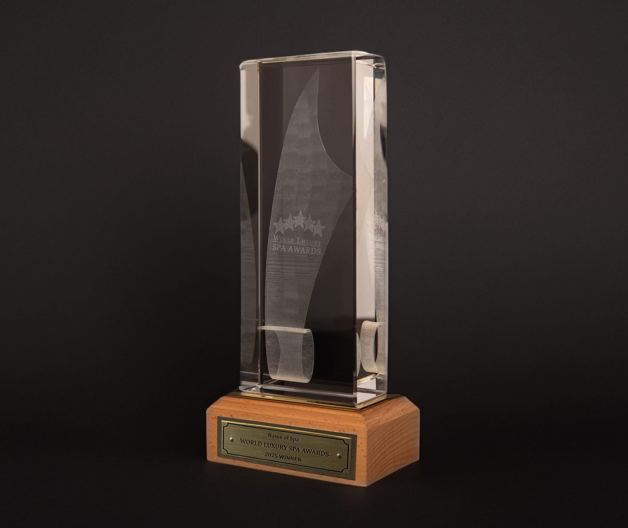 Elegant trophy design, intricately engraved into crystal glass using sub-surface laser technology. The 2025 Crystal Glass World Luxury Travel Awards Trophy is mounted on a pink Beachwood base with front brass detailing and includes a custom engraving of your establishment’s name and award year.