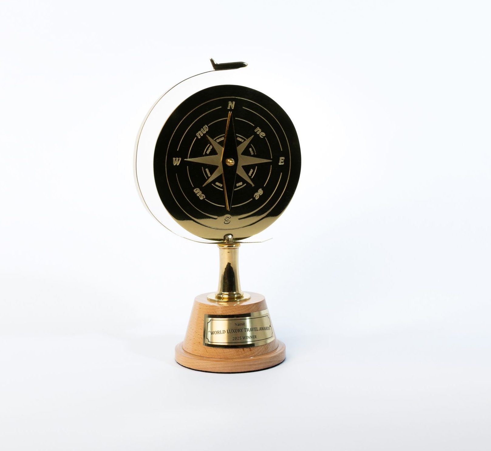 This sleek brass trophy rests on a pink beechwood base. Our exclusive 2025 World Luxury Travel Awards Trophy features a custom front engraving of your establishment’s name and award year.